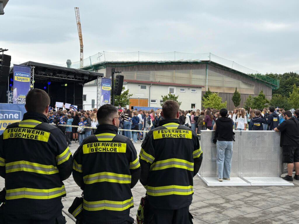 Einen besonderen Einsatz führten wir am Donnerstag, den 24. Juli 2025 mit der Wasserwacht und der Polizei Buchloe durch. Zur Absicherung des Antenne Bayern Schulfhof-Gigs stellten wir eine Sicherheitswache auf dem Gelände des Gymnasium Buchloe. Dort trat an diesem Donnerstagvormittag die Sängerin Leony auf.