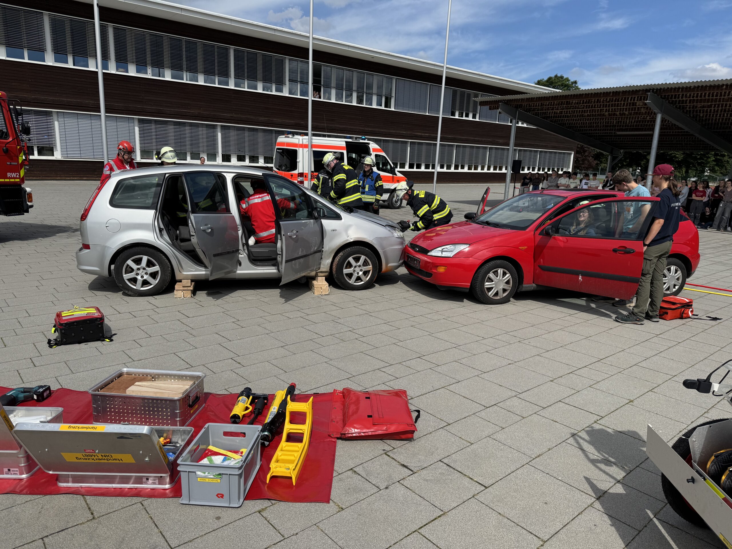 So gab es zu Beginn des Aktionsvormittags für die Oberstufenschüler eine Reihe von Kurzvorträgen: Vertreter der Polizei, der Feuerwehr Buchloe, der örtlichen Bereitschaft des Bayerischen Roten Kreuzes, der Notfallseelsorge des Bistums Augsburg und eine Fachanwältin für Verkehrsrecht gaben tiefgründige Einblicke in ihre Arbeit. Im Anschluss folgte eine realitätsnahe Einsatzübung auf dem Schulhof, um verschiedene Unfallfolgen (eine schwierige technische Rettung, ein möglicher Unfall mit Todesfolge, eine Strafanzeige, anstehende juristische Konsequenzen, physische Spätfolgen und psychische Belastungen) an einem konkreten Beispiel aufzuzeigen. Zwei Schüler durften sich sogar als „Unfallopfer“ aus den Fahrzeugen retten lassen.