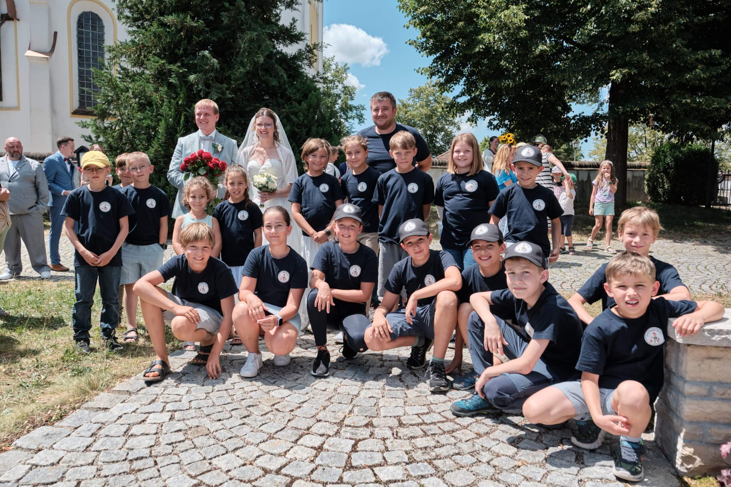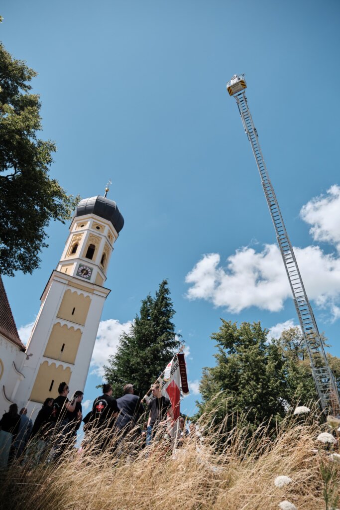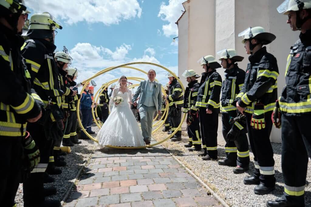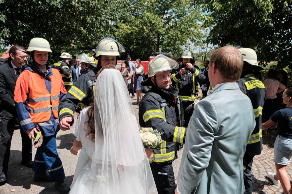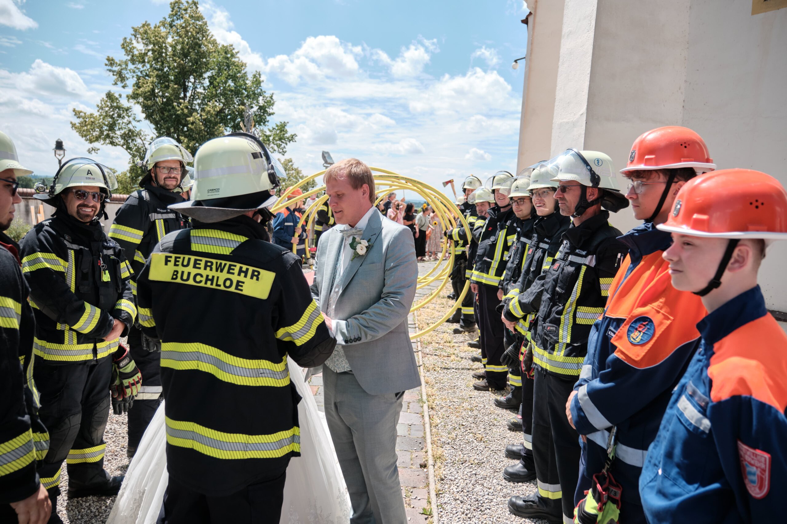 Eine Feuerwehrhochzeit im wahrsten Sinne feierten am Samstag, den 12. Juli 2025 unsere Feuerwehrkameraden Ronja und unser Feuerwehrkamerad Markus. Um die Mittagszeit waren vor der Lindenberger Kirche St. Georg und Wendelin Kinderfeuerwehr, Jugend und erwachsene Kameraden zum Spalierstehen angetreten. Die beiden Kommandanten und Vereinsvorstand Herbert Mayer überbrachten dem Brautpaar herzliche Glückwünsche im Namen der Buchloer Wehr.