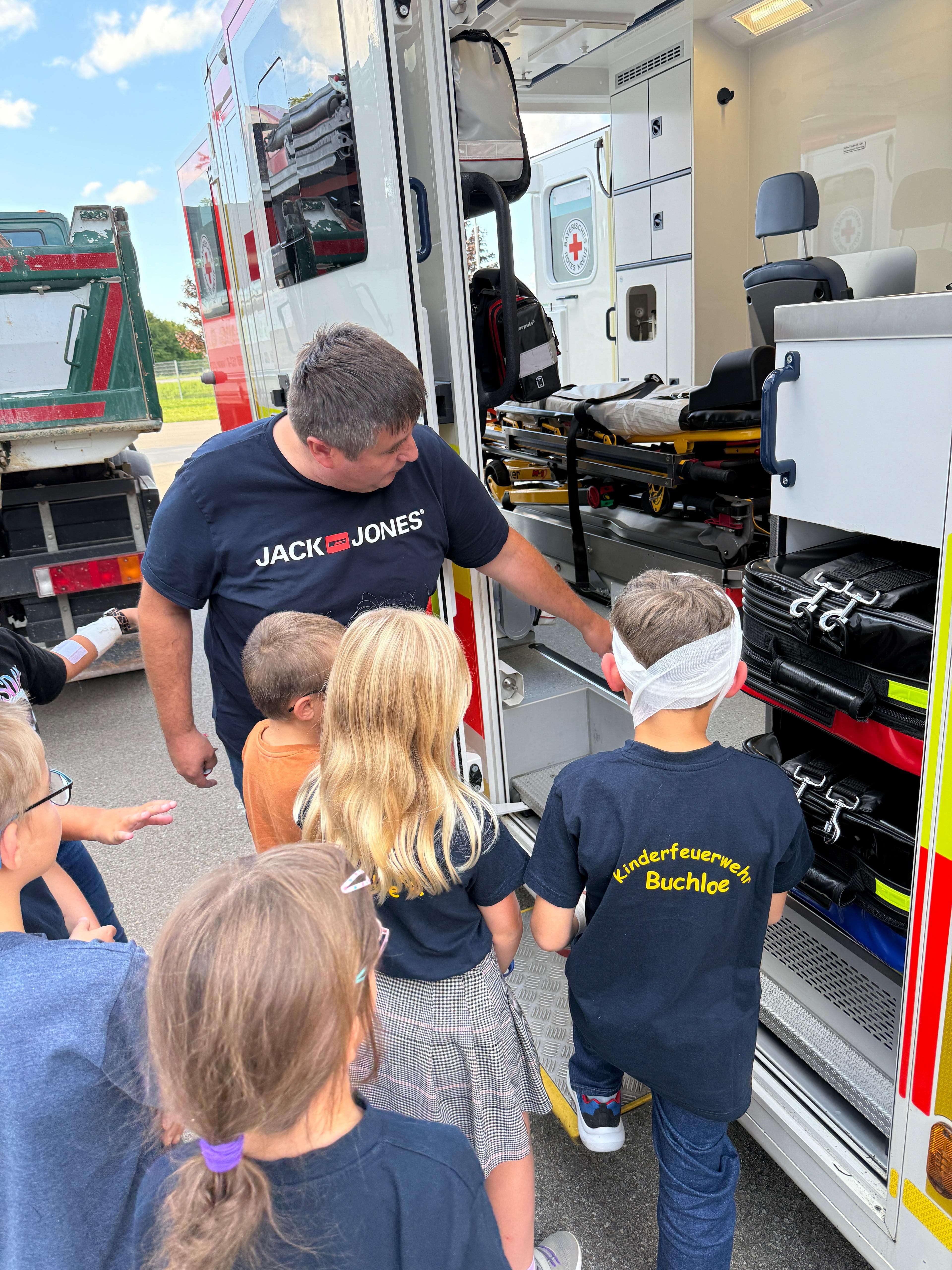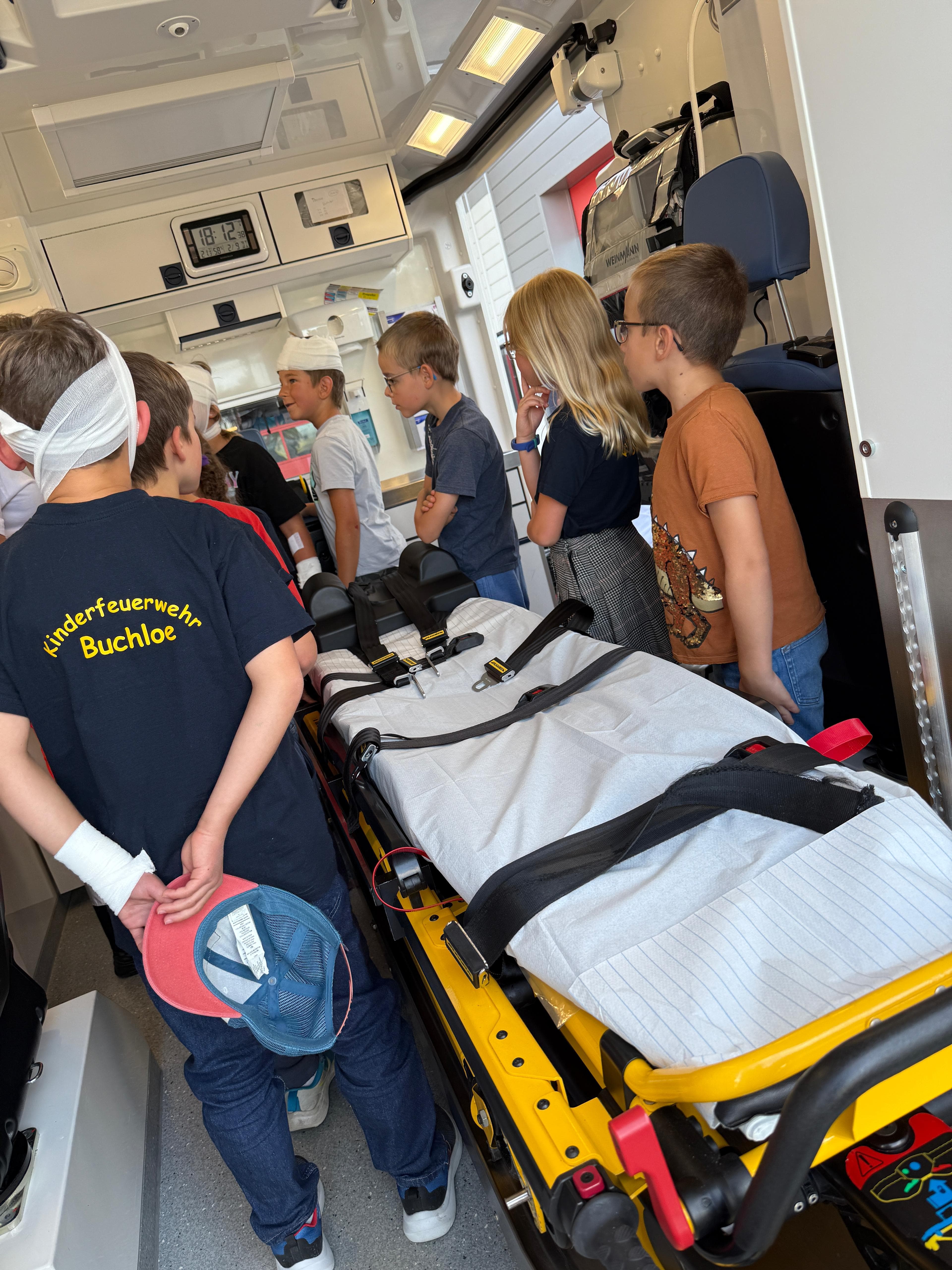 Damit ist der Buchloer Feuerwehrnachwuchs gleich auch bestens auf die Prüfung „Kinderflamme“ im Oktober vorbereitet. Als Highlight durften alle zum Schluss noch einen Rettungswagen von innen besichtigen – ein echtes Erlebnis!
